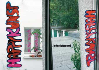 Zugleich sind im Kunstkontext spätestens seit der Konzeptkunst  glatte Wandbeschriftungen und Neonschriften Standard. Die Wandbeschriftungen dieser Ausstellung greifen dieses Klischee von streng intellektueller Konzeptkunst a la Lawrence Weiner auf, und spielen mit ihm. Der Künstler in der Rolle der backenden Hausfrau.